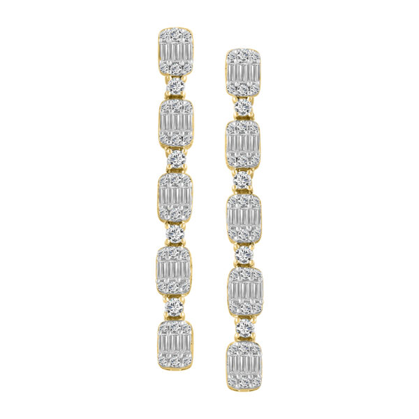 LADIES LINEAR EARRINGS 1.00CT ROUND/BAGUETTE DIAMOND 14K YELLOW GOLD